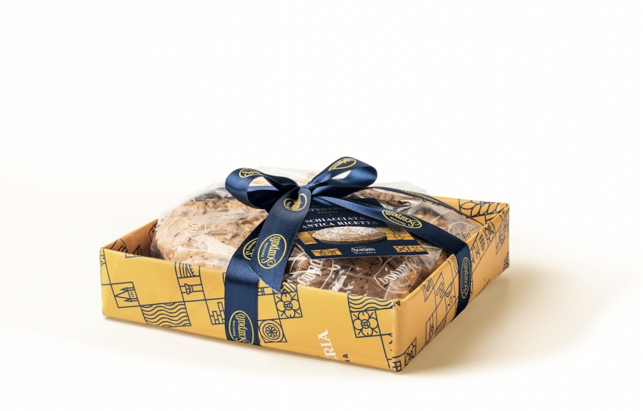 Schiacciata traditional soft flat cake covered with amaretto frosting, sliced almonds and icing sugar